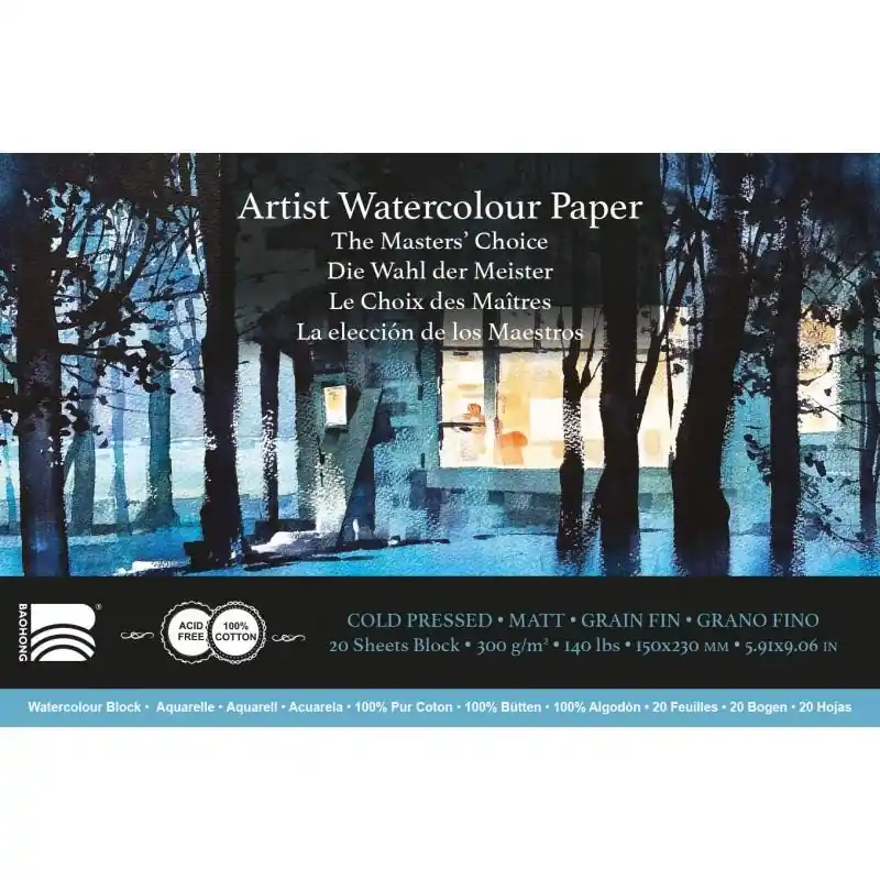 Bloc aquarelle BaoHong Le Choix des Maîtres 300 g/m², 20 fls collées 4 côtés – 12.5×18 cm/Grain torchon Expédition Rapide